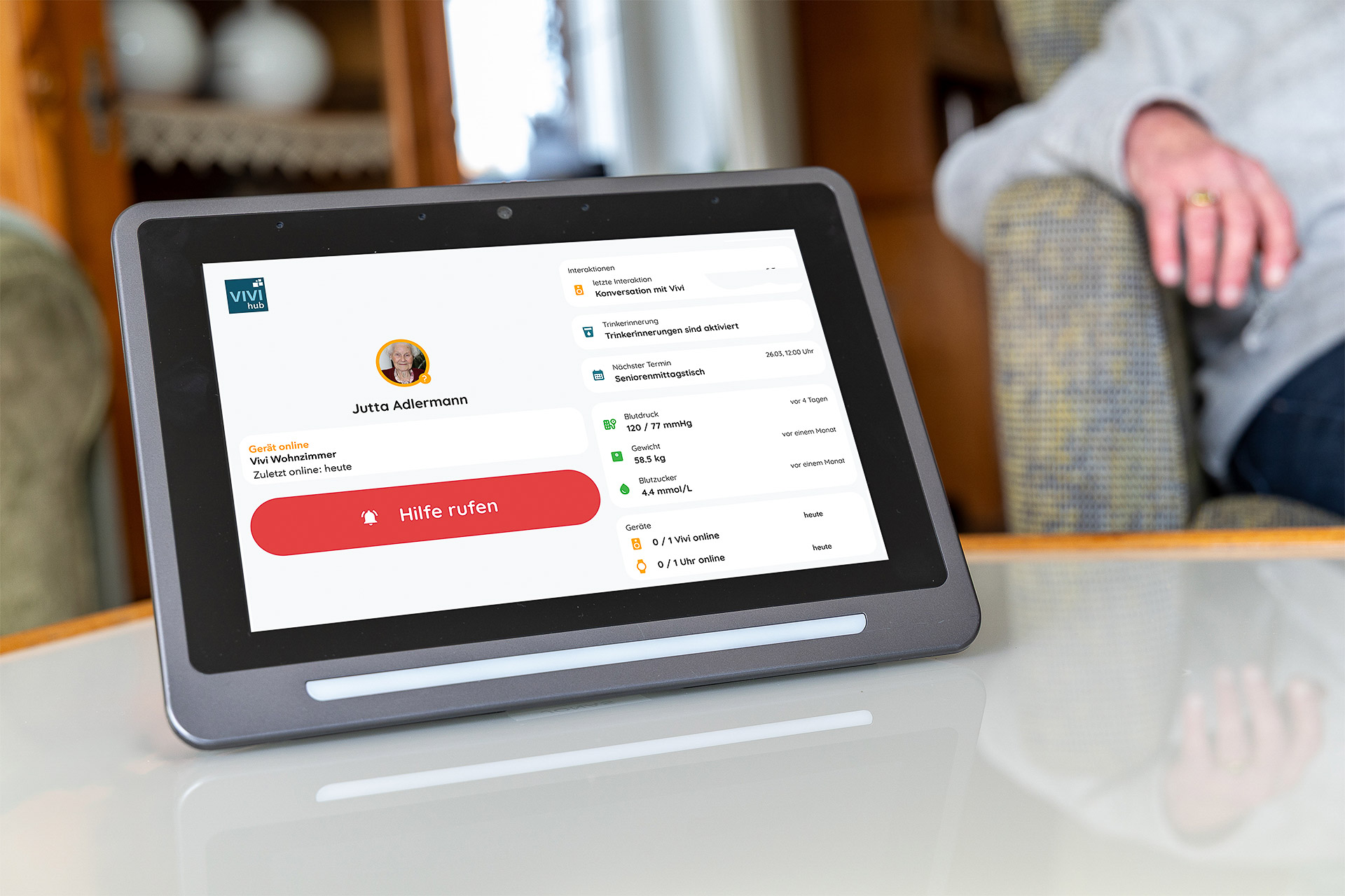 Der VIVI hub unterstützt im Alltag – direkt in der Häuslichkeit des Klienten oder im Bewohnerzimmer. Er erinnert zuverlässig an die Einnahme von Medikamenten, ans regelmäßige Trinken und an wichtige Termine. Gleichzeitig stellt er Vitalwerte übersichtlich dar, hilft bei der Strukturierung des Tages und organisiert im Bedarfsfall schnell Hilfe. Als datenschutzkonforme und speziell für die Pflege entwickelte Alternative zu herkömmlichen Sprachassistenten entfaltet der VIVI Hub sein volles Potenzial als digitaler Begleiter. Zusätzlich lassen sich bequem Wetterinformationen und aktuelle Nachrichten abrufen – alles per Sprache.