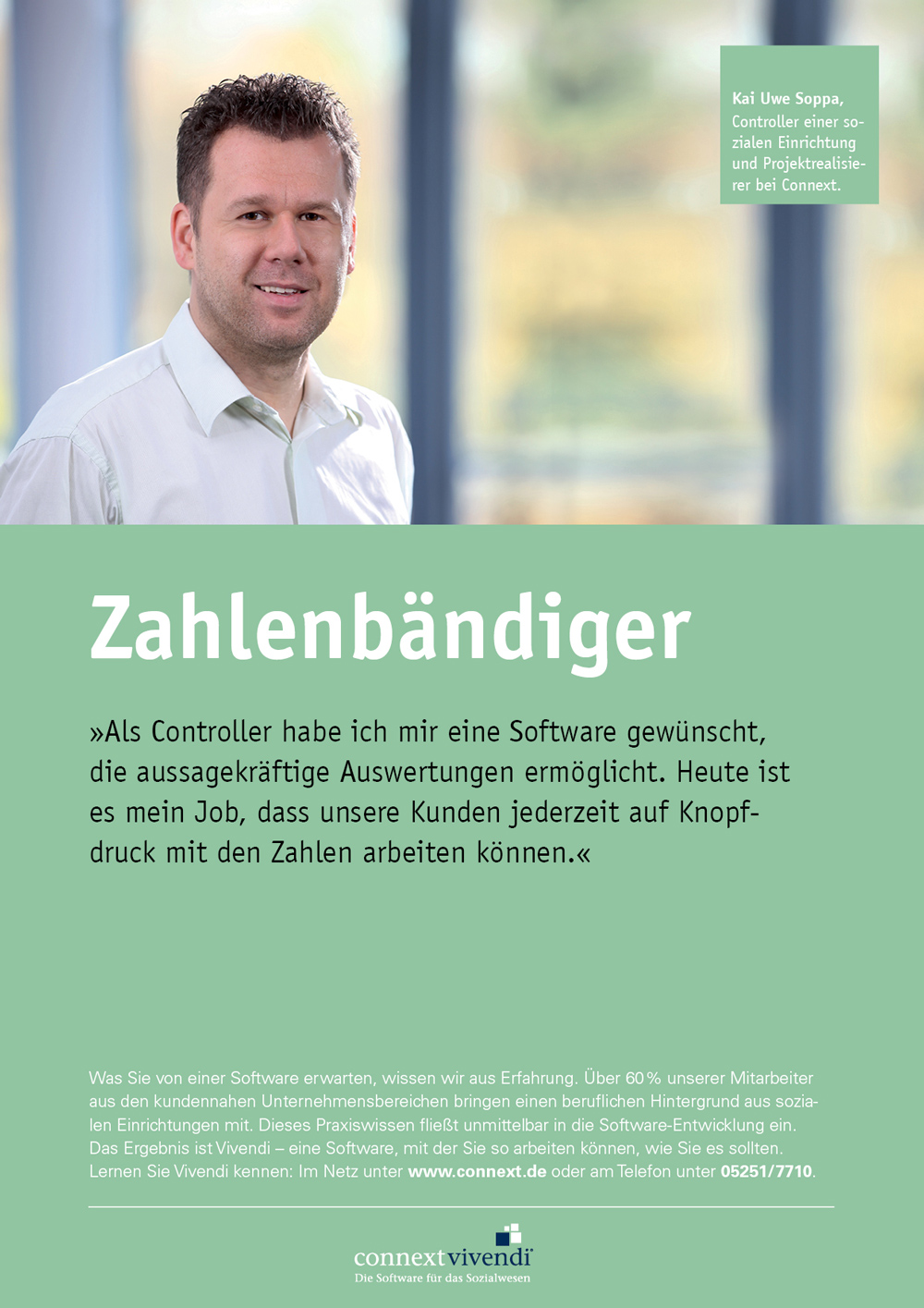 Connext-Kunden wissen es längst: gelebte Kundennähe ohne Wenn und Aber ist bei Connext nicht nur ein Lippenbekenntnis. In unserer Anzeigenkampagne berichten Connext-Mitarbeiter, die über einen beruflichen Hintergrund in sozialen Einrichtungen verfügen, wie diese Erfahrungen die tägliche Arbeit bereichern und auch Kunden davon profitieren – z.B. im täglichen Kontakt an der Hotline, in Seminaren oder bei der Softwareeinführung. Eine seltene Spezies sind die Mitarbeiter mit den ungewöhnlichen Berufsbezeichnungen wie ›Zahlenbändiger‹, ›Rückenfreihalterin‹ oder ›Soziemlichalleswisserin‹ jedoch nicht: über 60 % unserer Beschäftigen aus den kundennahen Unternehmensbereichen bringen Berufserfahrungen aus sozialen Einrichtungen mit. Dieses Praxiswissen fließt unmittelbar in die Software-Entwicklung ein und ist mit ein Grund, warum Kunden sich bei Connext besser verstanden fühlen als anderswo.