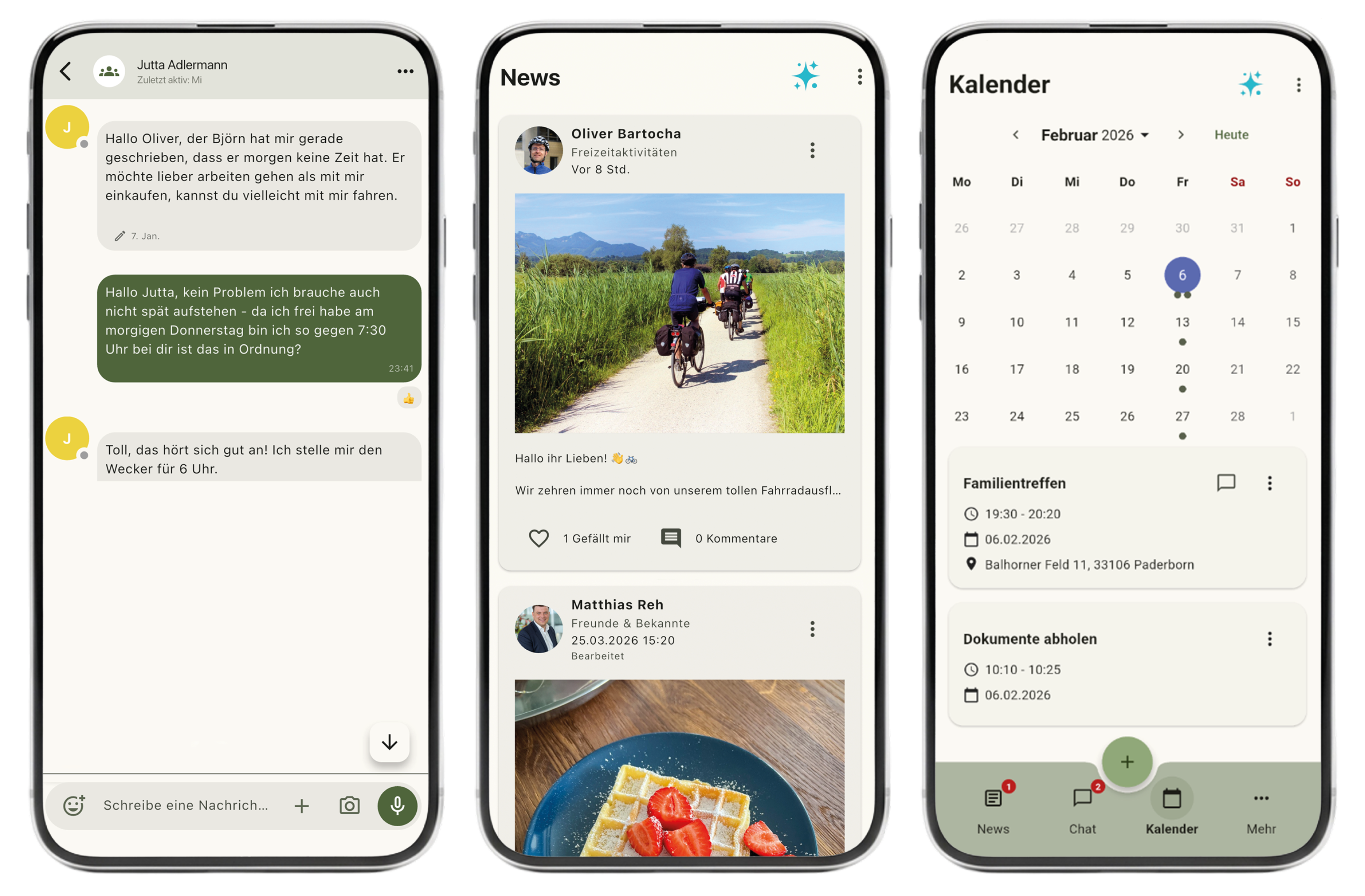 Mit der App VIA Vivendi können Angehörige, Freunde, Nachbarn, Ehrenamtliche und professionelle Pflegekräfte zu einer starken Sorgegemeinschaft zusammenwachsen. Über den Ende-zu-Ende-verschlüsselten Chat lassen sich zum Beispiel Arzttermine, Besorgungen oder Freizeitaktivitäten einfach abstimmen und direkt in einem gemeinsamen Kalender festhalten. Ähnlich wie in bekannten Social-Media-Apps können auch Erinnerungen im Newsfeed geteilt werden – das stärkt den Austausch und das Gemeinschaftsgefühl. So entsteht aus vielen einzelnen Helfenden ein gut organisiertes, verlässliches Netzwerk rund um die unterstützte Person.